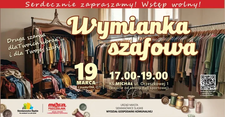 W Siemianowicach Śląskich mieszkańcy będą mogli wymienić ubrania i dać im drugie życie podczas wiosennego spotkania w miejskim obiekcie sportowym. Akcja ma przypominać, że porządki to też szansa na oszczędność i mniejsze obciążenie dla środowiska; wystarczy zabrać rzeczy w dobrym stanie, by znaleźć coś dla siebie. Organizatorzy zapraszają do wspólnego przeglądu garderób i rozmów przy wieszakach.