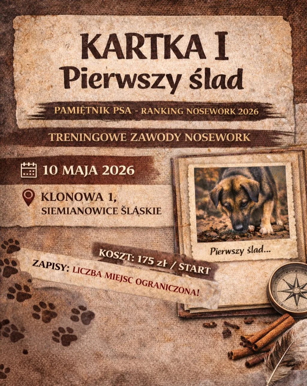 W Siemianowicach Śląskich szykuje się coś dla psów z dobrym nosem i opiekunów, którzy lubią wyzwania z odrobiną emocji KARTKA I: Pierwszy ślad otwiera cykl PAMIĘTNIK PSA – RANKING 2026 i od razu zaprasza do sportowej zabawy w stylu „sprawdzam siebie i swojego psa”. To treningowe zawody nosework, w których liczy się spokój, koncentracja i współpraca — brzmi jak świetny plan na majowy poranek, więc warto mieć tę datę na oku.