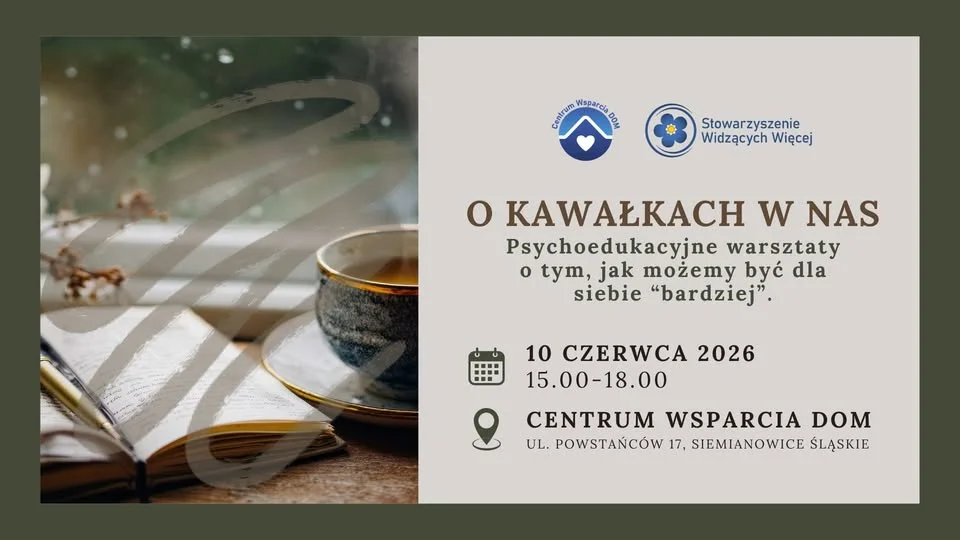 Czasem najbardziej potrzebujemy nie kolejnej listy zadań, tylko chwili, żeby spokojnie przyjrzeć się sobie i złapać trochę więcej życzliwości. Właśnie taki ma być warsztat „O kawałkach w nas… Jak możemy być dla siebie bardziej?” – trzy godziny o uważności, wewnętrznym wsparciu i budowaniu bezpieczniejszej relacji ze sobą samą. To propozycja dla osób, które chcą na moment zwolnić i zrobić miejsce na refleksję. Jeśli ten temat jest Ci bliski, warto się zapisać.
